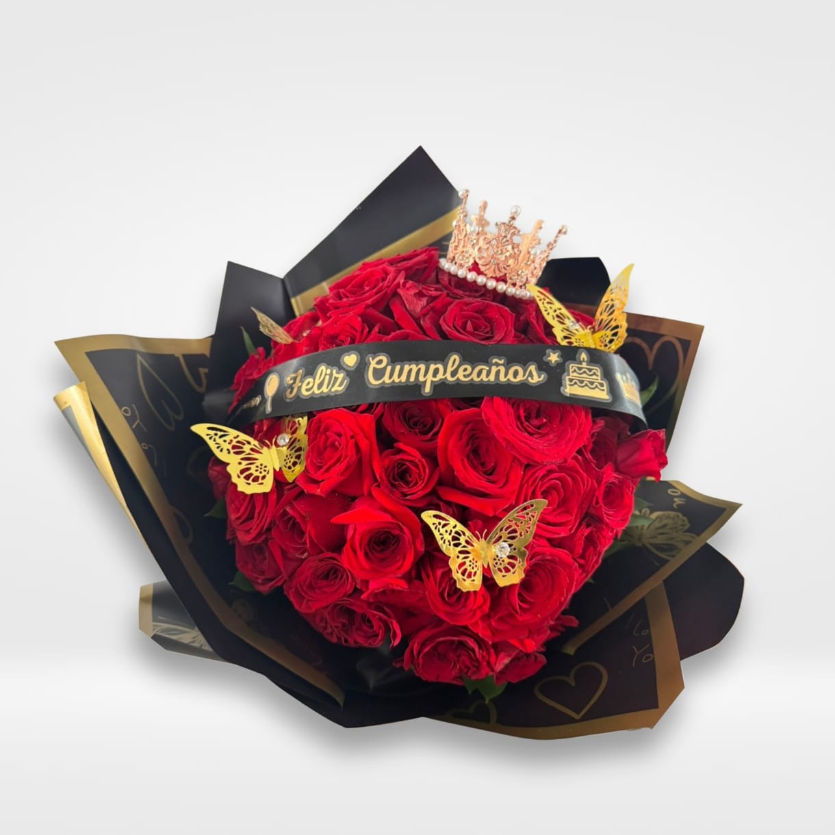Decorado con corona y delicadas mariposas, y un elegante listón negro con mensaje de cumpleaños que resalta su majestuosidad
